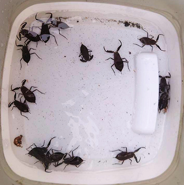 ヒメタイコウチは体長20mmほどの水生昆虫で、浅い水域(水路の落ち葉の間など)に生息しています。